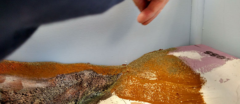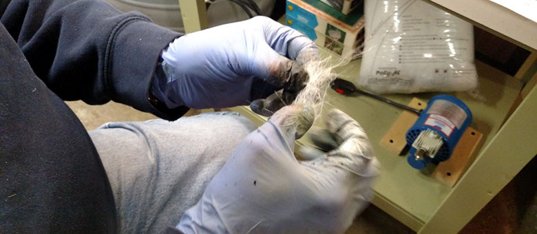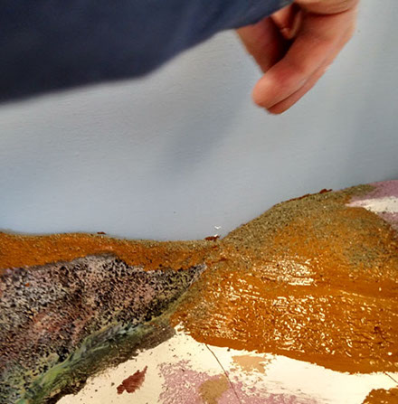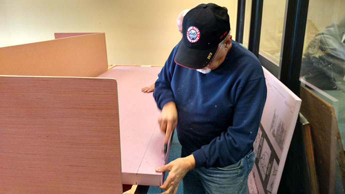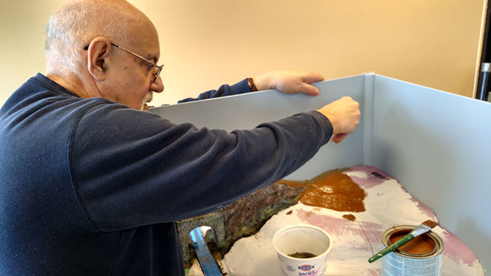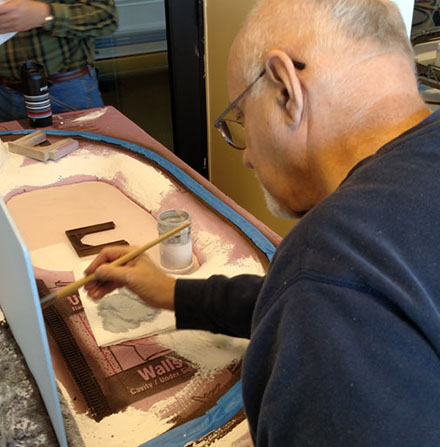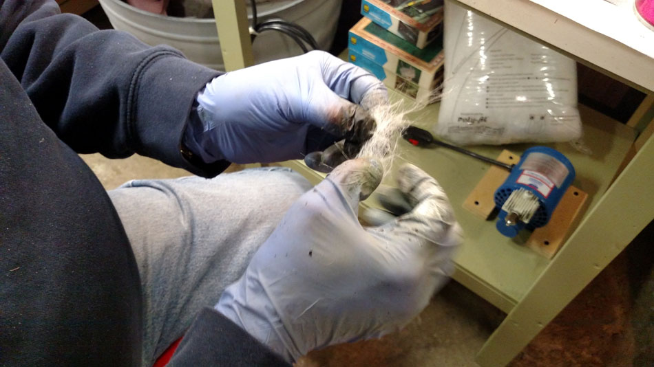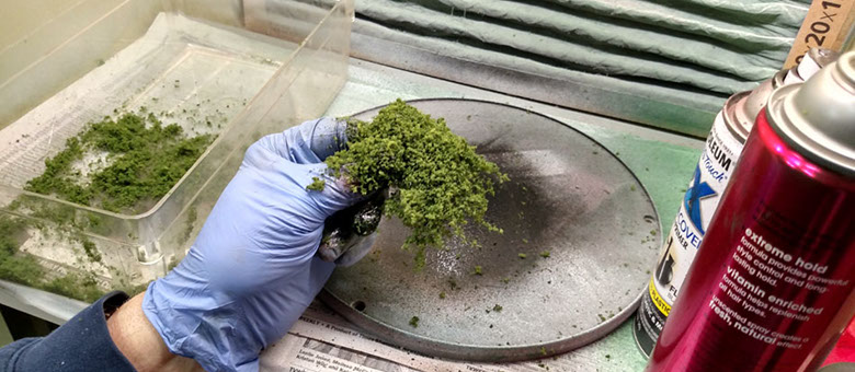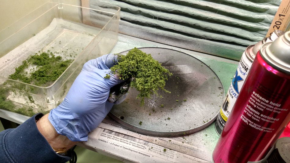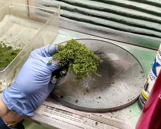 Making the shrubbery and bushes. Mike takes a piece of furnace filter and stretches it out.