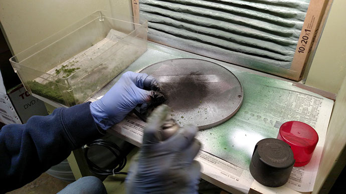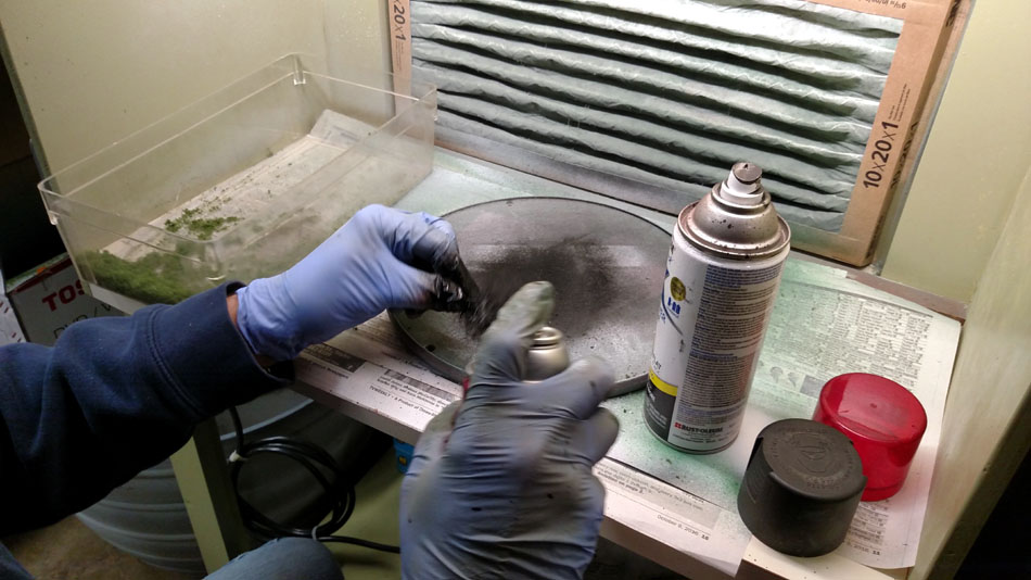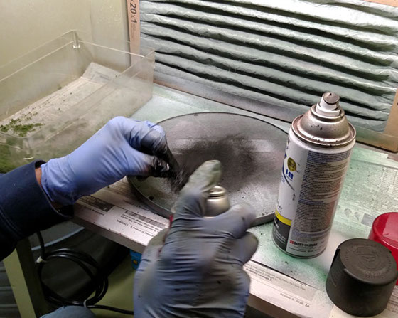 He then sprays Hair Spray, of all things, to get a sticky surface.
