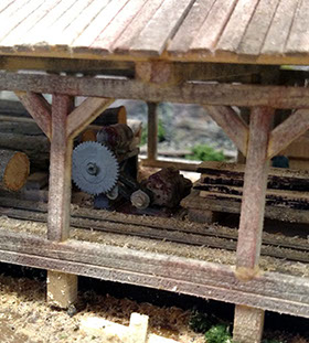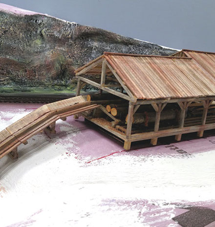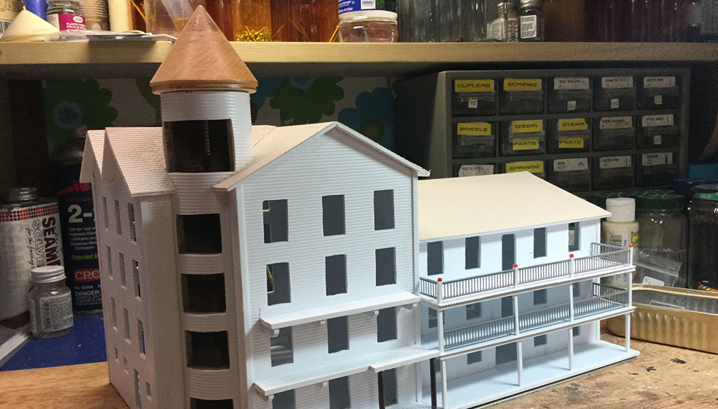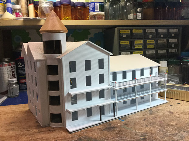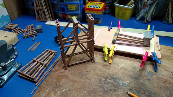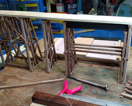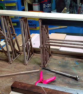 Mike made a jig (background) that allows the gluing of the various sized towers needed to support the tracks.
